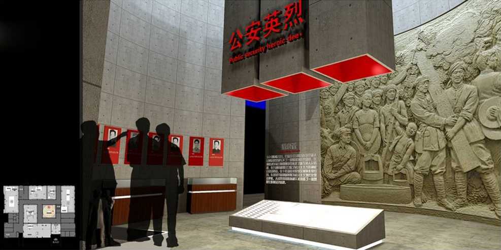 公安英烈展廳中,大面積的使用了浮雕的展示手法來生動(dòng)的表達(dá)英烈革命形象。旁邊英烈的照片用于觀者表達(dá)對(duì)英雄的追憶致敬。在展區(qū)正中間混凝土結(jié)構(gòu)頂與下面的底座進(jìn)行呼應(yīng),營(yíng)造了更加嚴(yán)肅的氛圍。
